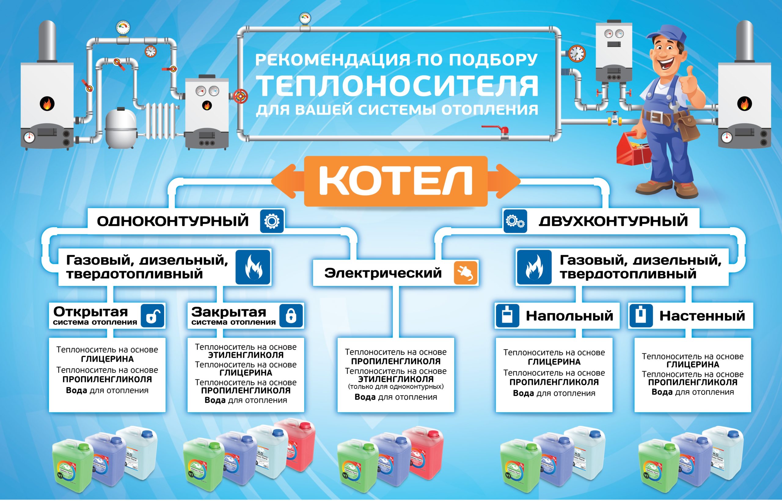 - Учитывайте тип конструкции вашей отопительной системы – открытая или закрытая. В случае открытой системы предпочтительнее использовать состав на основе пропиленгликоля.