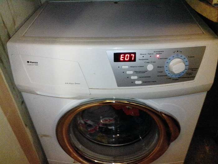 | E07 | Проблема с датчиком уровня воды | Отключите машину от сети. Вызовите специалиста. |