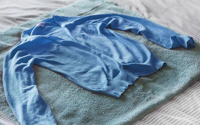 - После этого дайте воде стечь в течение нескольких минут, а на ровной поверхности расстелите плотное полотенце. Когда лишняя влага уйдет, положите вещь на полотенце и сверните его в тугой рулон, чтобы удалить остатки влаги.