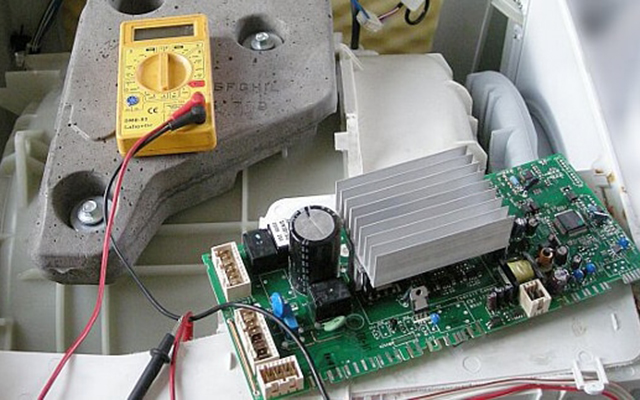 Затем проверьте состояние двигателя, особенно его обмотку на наличие обрывов. Если обрыв все же обнаружен, замените его на исправный элемент. Также осмотрите двигатель на предмет попадания воды. Вблизи него находятся ТЭН и блок подшипников, а также отдел для загрузки стиральных средств, что создает множество источников, откуда может просочиться вода.