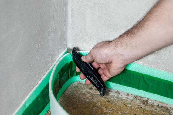 - Вдоль стен всего помещения по периметру укладывается специальная лента. Если в конструкции имеются колонны, их также следует обшить по краям. Важно, чтобы укладка была непрерывной; если необходимо соединить элементы, делайте это внахлест и фиксируйте с помощью скотча или степлера. Работы начинаются с угла комнаты, укладывать ленту в натяжку не рекомендуется.