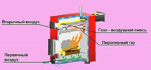 Пиролизный газ, образующийся при тлении древесины и состоящий из метана и угарного газа, направляется в специальную камеру. Здесь он смешивается с потоком вторичного воздуха и воспламеняется высокотемпературным пламенем ярко-белого цвета, в котором сгорают частицы сажи. Все горючие компоненты древесины полностью сжигаются, что повышает коэффициент полезного действия и эффективность использования печи данной конструкции. Таким образом, топливо, загруженное в печь, прогорает дважды, что значительно увеличивает теплоотдачу системы отопления.