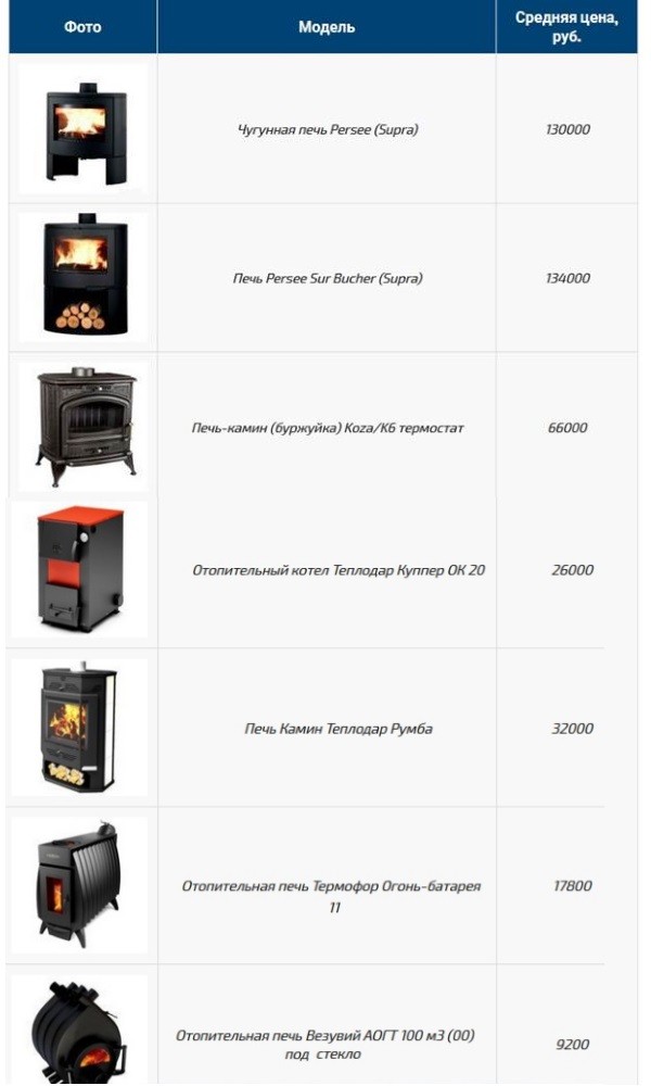 Таблица 1. Средняя стоимость различных модификаций печей длительного горения.