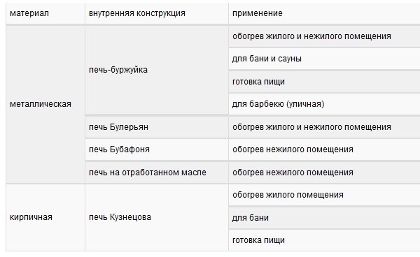 Печи длительного горения имеют разнообразие в зависимости от их назначения, используемых материалов, расположения топочных камер и методов передачи тепла. Классификация этих отопительных устройств представлена в следующей таблице:
