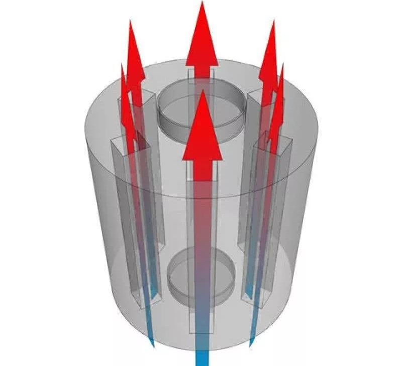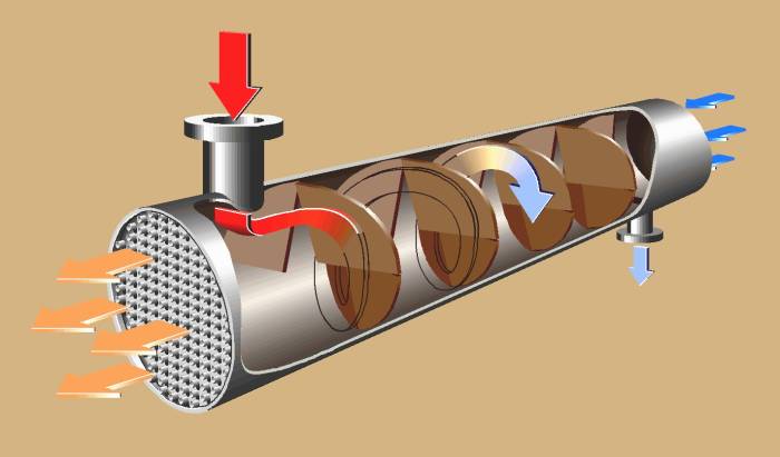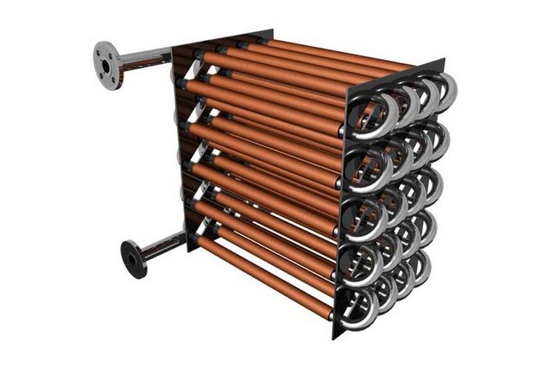 Эффективность этого устройства подтверждена, и оно пользуется популярностью. В его конструкции нет ничего сложного – это стандартный теплообменник, который соединяется с системой через трубы. Для увеличения площади нагрева трубы размещаются в шахматном порядке.