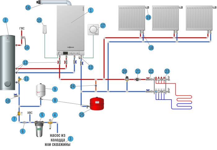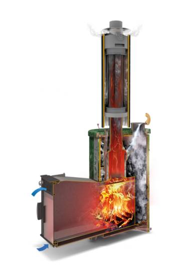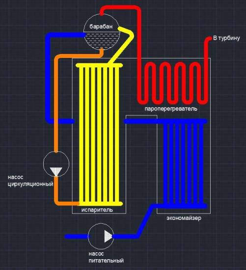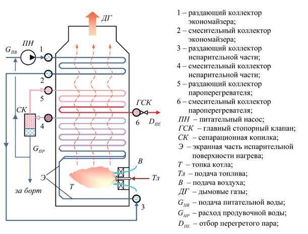 На выходе температура воды оказывается ниже, чем в самом котле. Трубопроводы в данной системе располагаются вертикально, что позволяет регулировать температуру подогрева с помощью обходного борова и шиберов.