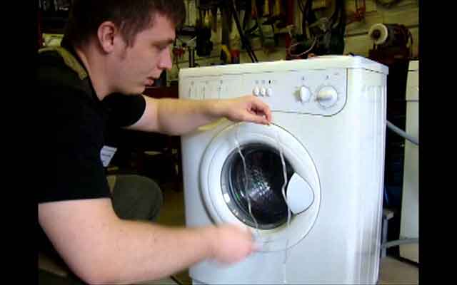 Если этого не произошло, можно попробовать открыть люк вручную, для чего понадобятся веревка и отвертка. Веревку следует продеть в щель вокруг дверцы и сильно потянуть – это должно сдвинуть крючок замка и освободить люк. Этот метод подходит не для всех моделей, например, в стиральных машинах марки Канди Aquamatic замок работает иначе.