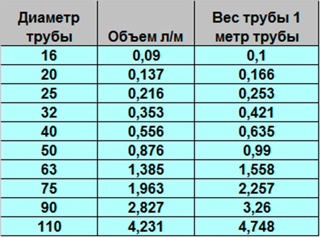 Объем трубы длиной 1 метр и диаметром 15 мм составляет 0,176 литра, диаметром 20 мм – 0,3 литра, а диаметром 25 мм – 0,485 литра. Умножив эти значения на длину труб, вы получите общий объем, занимаемый теплоносителем в трубах.