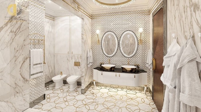 | Современная классика | Мрамор (светлый или темный), латунные или бронзовые акценты, фрезерованные фасады, зеркала в изящных рамах, отдельно стоящие ванны. | Сочетание классических форм с современными технологиями (умные зеркала, сенсорные смесители), использование крупноформатного керамогранита под мрамор, глубокие оттенки (изумрудный, сапфировый) в текстиле или акцентных стенах, деликатное использование лепнины. |