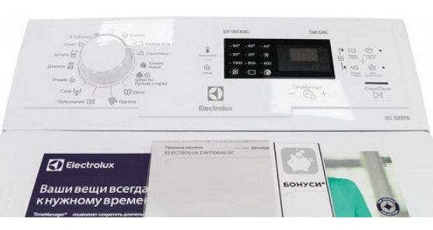 Электролюкс EWT 1064 ILW. Это одна из лучших вертикальных стиральных машин с компактными размерами (40×60×89 см) и максимальной загрузкой до 6 килограммов сухого белья. Устройство автоматически определяет вес загруженных вещей и подбирает наиболее подходящий режим стирки. В арсенале 14 программ, включая специальные режимы для джинсов, шерсти, пуховиков, шелка и спортивной одежды. Особенно востребован ночной режим, система контроля за удалением пятен и экологичный режим. Энергетическая эффективность класса А+++ при этом обеспечивает экономный расход воды.