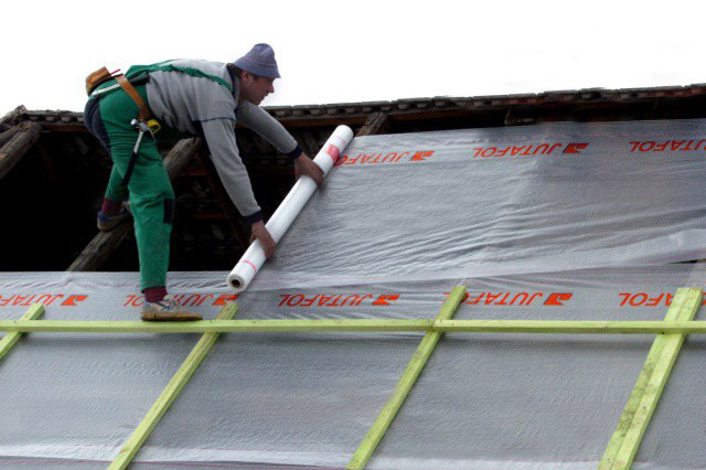 Полотна пленки укладываются исключительно поперек ската, при этом следует обеспечить нахлест не менее 100 мм. Крепление соседних полотен осуществляется с помощью клейкой ленты, а провис в центре полотна не должен превышать 20 мм.