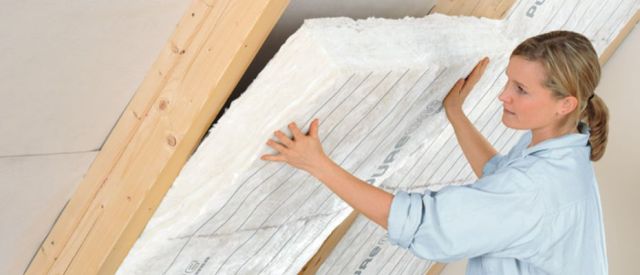 Материал необходимо укладывать между стропилами в сжатом состоянии, то есть «враспор». Это обеспечит надежную фиксацию благодаря трению, возникающему между боковыми поверхностями.