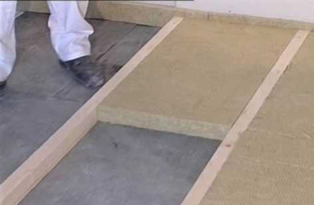 - Между лагами укладывается минеральный утеплитель, ширина которого должна немного превышать расстояние между деревянными брусьями, что обеспечит лучшую герметизацию.