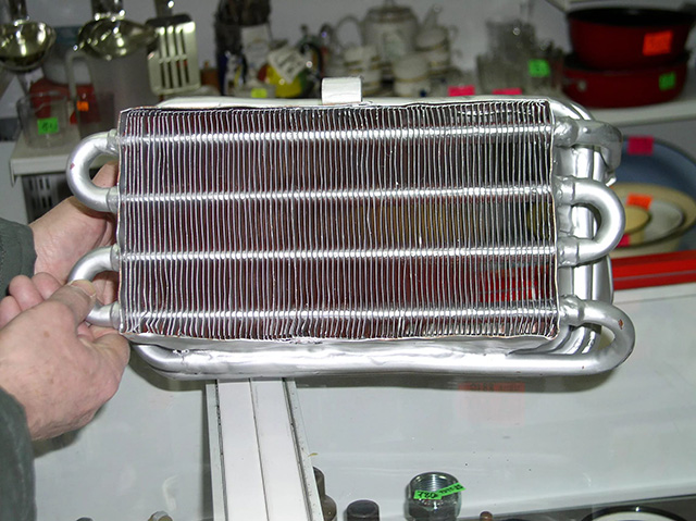 - На стенках теплообменника может образоваться нагар или накипь внутри. Очистите внешнюю поверхность: для этого снимите теплообменник, поместите его в горячий мыльный раствор на 20-30 минут, затем очистите щеткой. После этого просушите и установите на место.