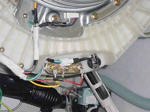 Когда доступ к нагревателю будет открыт, его легко узнать, и спутать с другими деталями машины практически невозможно. Хотя основная часть нагревателя скрыта внутри бака, снаружи хорошо видны его контакты.