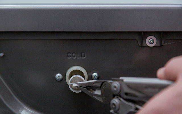 - Аккуратно извлеките небольшой фильтр вместе с сеткой, находящийся внутри отверстия, с помощью пассатижей или плоскогубцев, и поместите его в емкость с водой.