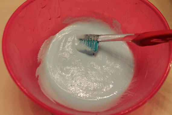 - Используя зубную щетку, аккуратно обработайте загрязненные участки, периодически промывая щетку от грязи;