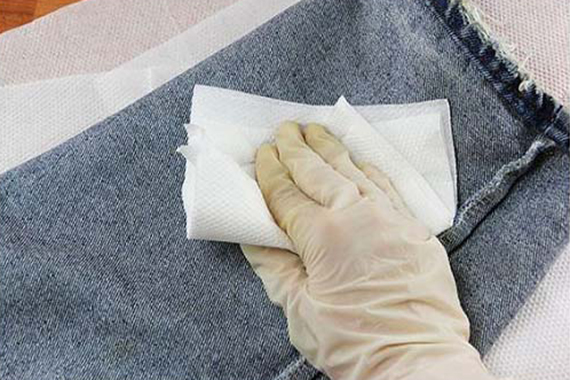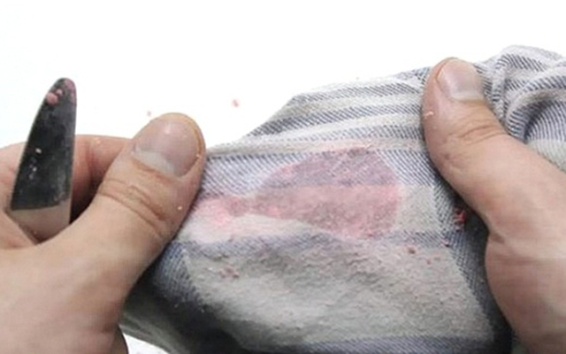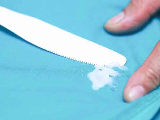 После этого направьте поток пара на пятно, не забывая периодически менять полотенца. С помощью острого инструмента, например, канцелярского ножа, аккуратно соскоблите загрязнение. Если же ткань тонкая и синтетическая, достаточно просто хорошенько потереть, и большая часть грязи легко отойдет.