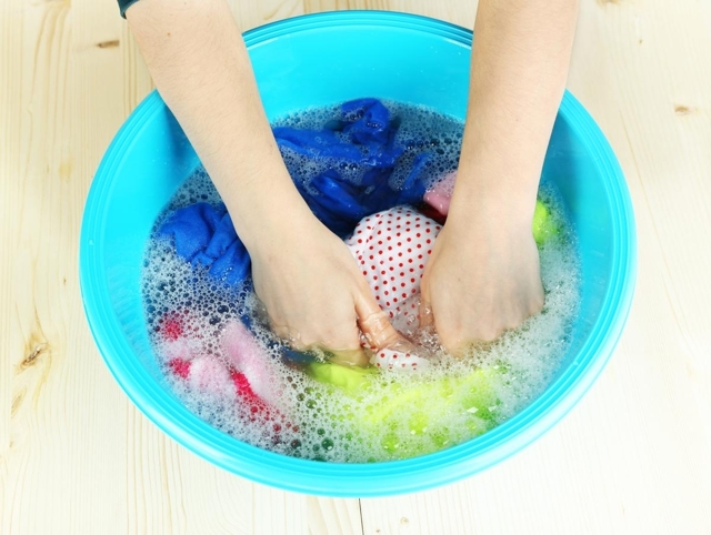 Наполните небольшую емкость теплой водой, добавьте стиральный порошок и оставьте одежду замачиваться на несколько часов, затем тщательно прополощите.