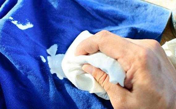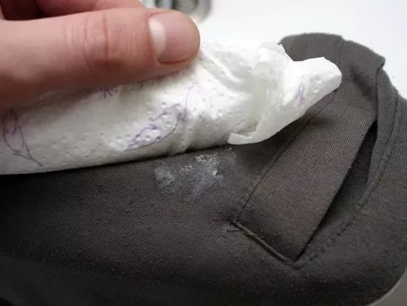 Расстелите одежду на ровной поверхности, под проблемную зону подложите ненужную ткань или подкладку. Смочите ватный диск в растворителе и начинайте аккуратно оттирать, двигаясь от краев к центру. Меняйте вату по мере загрязнения, а завершающим этапом станет стирка.