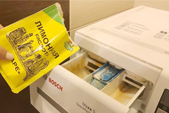- В лоток для стирального порошка высыпается стакан лимонной кислоты;