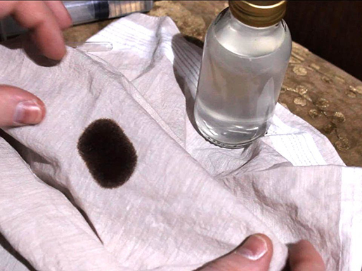 Очистка осуществляется с помощью небольшого кусочка белой ткани, смоченного в перекиси. Тщательно терите пятно до полного исчезновения следа.