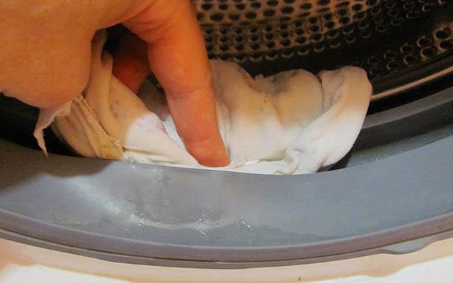 После этого следует оставить раствор на несколько часов, а затем можно запустить стирку в обычном режиме, не смывая остатки. Если на манжете образуется серый налет, наденьте резиновые перчатки, удалите видимую грязь, а затем, отогнув края манжеты, протрите ее изнутри хлопковой салфеткой, смоченной в Доместосе.