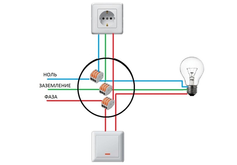 Если провода от светильника выходят в распределительную коробку, то для подключения выключателя розетка должна обязательно иметь заземление, и к ней должно подходить три провода.