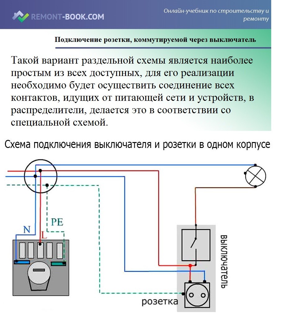 | Схема подключения (розетка от выключателя) | Фаза (L) от щитка идет на выключатель, затем от выключателя на один контакт розетки. Ноль (N) и заземление (PE) напрямую от щитка на розетку. | Убедитесь, что выключатель разрывает фазу. |