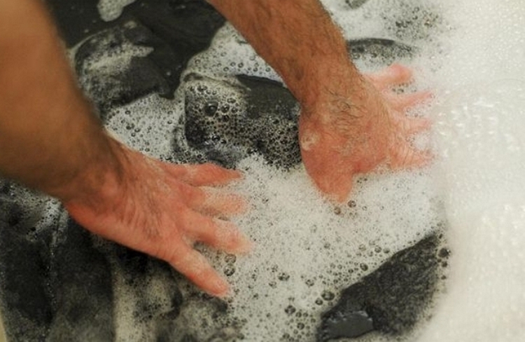 Наберите в большую емкость воду, температура которой не должна превышать 35-40 градусов. Затем растворите в ней средство для стирки и замочите одежду на 10-15 минут. Для лучшего удаления грязи можно использовать щетку с мягкой щетиной или губку.