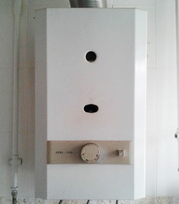 Шток, преодолевая сопротивление возвратной пружины, открывает газовый клапан. Газ поступает на коллектор, равномерно распределяется и попадает на сопло, секции горелки, где поджигается запальным пламенем. Это пламя нагревает медный теплообменник, который, в свою очередь, нагревает проходящую через него воду, обеспечивая ее подогрев. Отработанные газы выводятся через газоотводящее устройство в дымоход.