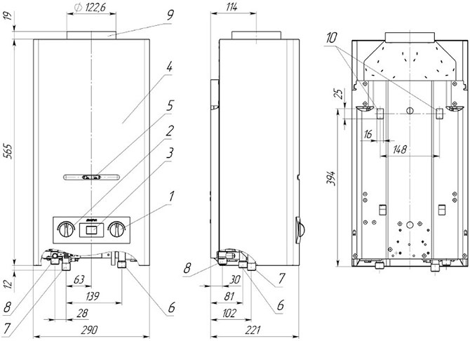 8 – штуцер для отвода горячей воды, резьба G ½;