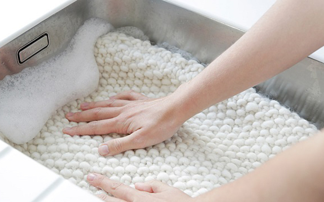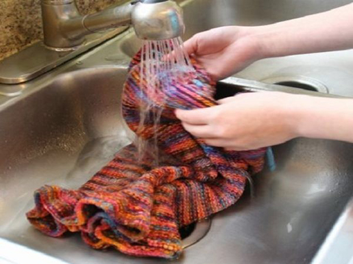 Изделие помещается в ванночку так, чтобы вода полностью его покрывала. Через полчаса шарф нужно аккуратно «пожимать» несколько раз, избегая сильного давления, чтобы не повредить его форму.