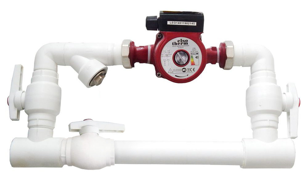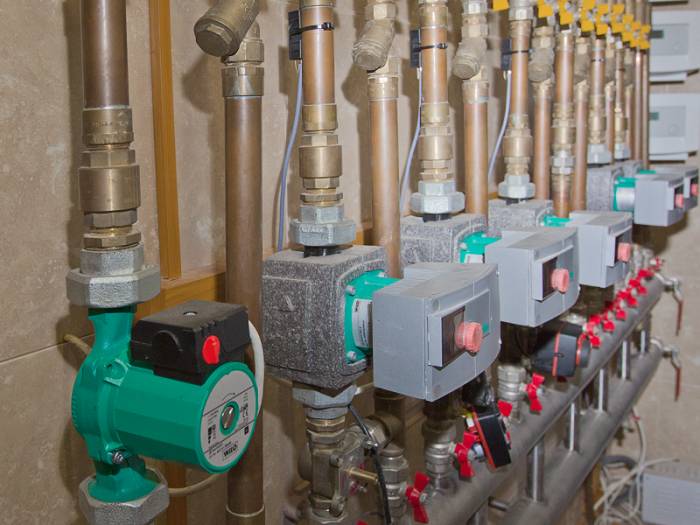 - Затем собирается нижний узел на обратной линии, и циркуляционный насос подключается к электросети. Устройство можно обслуживать без его отключения: чистятся фильтры и снимаются показания манометра. Если значения отклоняются от нормы, оборудование отключается и настраивается.
