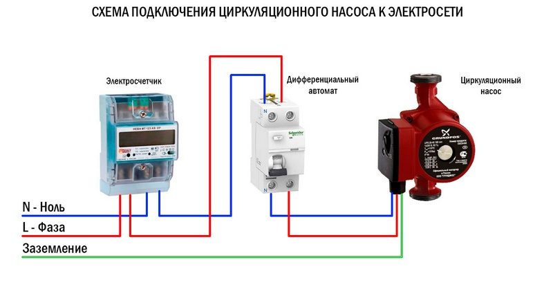 Важно помнить, что подключение циркуляционного насоса к простой розетке без заземления категорически запрещено. Подключение может осуществляться либо через бесперебойный источник питания (что позволяет одновременно подключить насос и котел), либо через дифференциальный автомат (что является наиболее простым вариантом). Также возможно подключение к автоматам котла.