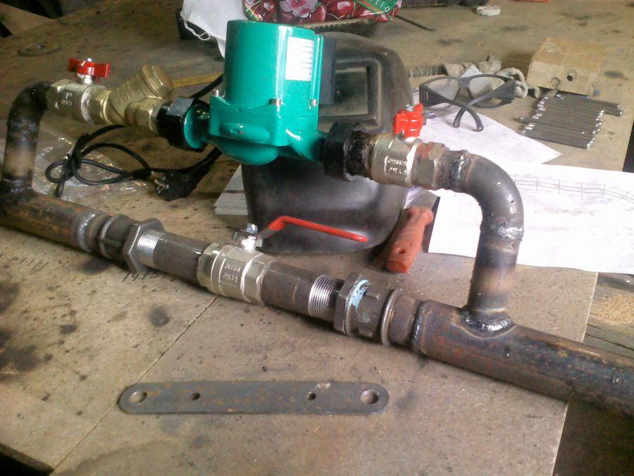 - Начинаем монтаж насоса с сборки узлов с кранами. Два узла устанавливаются по бокам от насоса, а третий будет частью прямой трубы. На этом этапе важно измерить участок обратной линии, куда будет установлен элемент с краном.