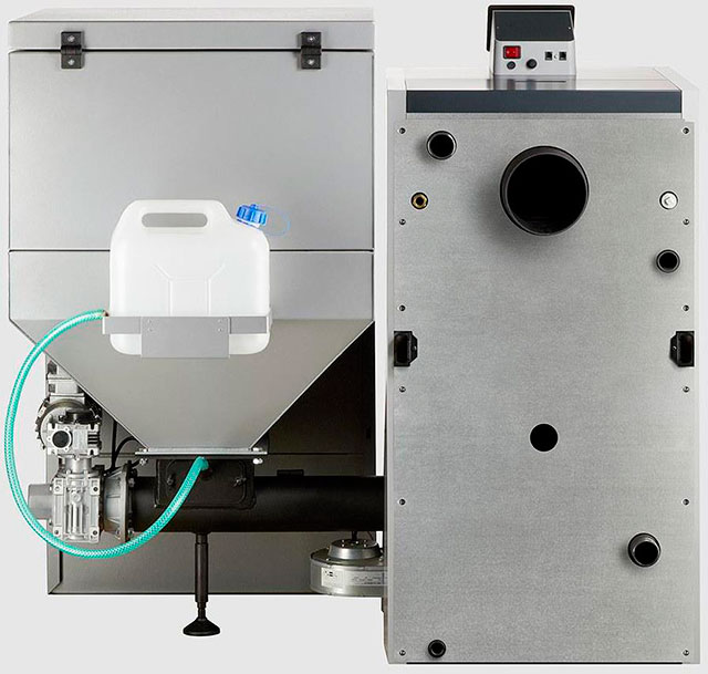 Бункер для хранения топлива. Одним из главных достоинств котла, работающего на пеллетах, является возможность автоматической подачи гранул. Топливо хранится в бункере, откуда с помощью автоматизированной системы оно поступает в горелку. Объем такого хранилища может достигать одного кубического метра. При необходимости бункер можно увеличить, подключив силос или дополнительное механизированное хранилище. Это позволяет котлу функционировать без дозаправки в течение нескольких месяцев.