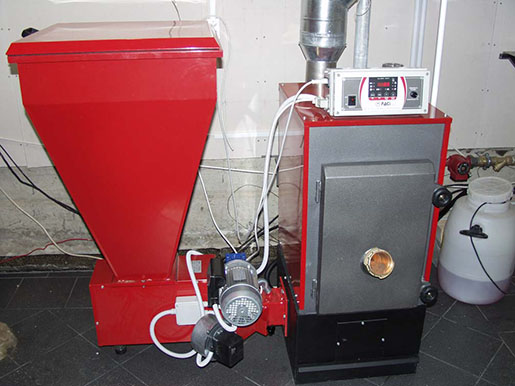 Принцип работы котла достаточно прост: гранулы поступают в горелку через шнек. В процессе сгорания топливо передает тепловую энергию теплоносителю, который, циркулируя по радиаторам, обогревает воздух в помещении.