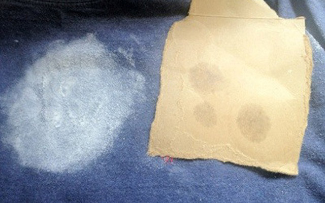 Посыпьте пятно любым абсорбирующим веществом, которое у вас есть под рукой, например, детской присыпкой, крахмалом или растертым мелом. Чтобы избежать появления белых разводов и повреждения ткани, проводите эту процедуру с изнаночной стороны.
