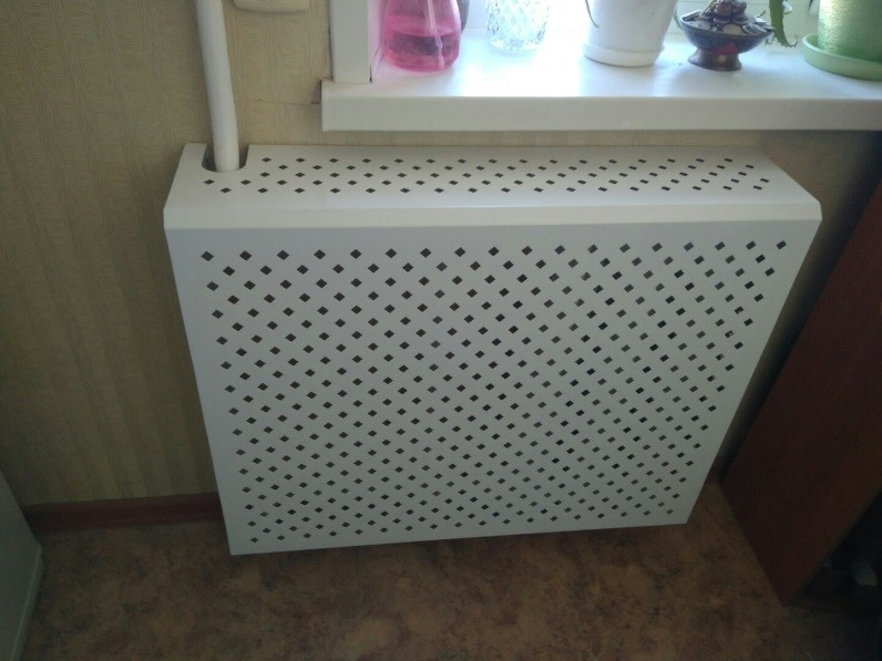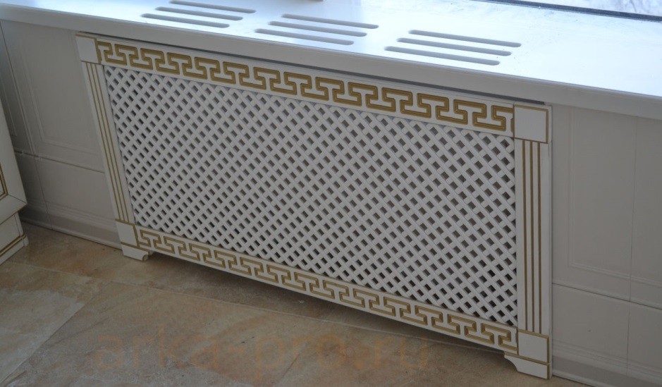 Совет! Размер решетки следует подбирать так, чтобы она немного превышала ширину радиатора, по краям которого располагаются вводные и выводные соединения, а также краны. Таким образом, мы обеспечиваем доступ к этим техническим элементам.
