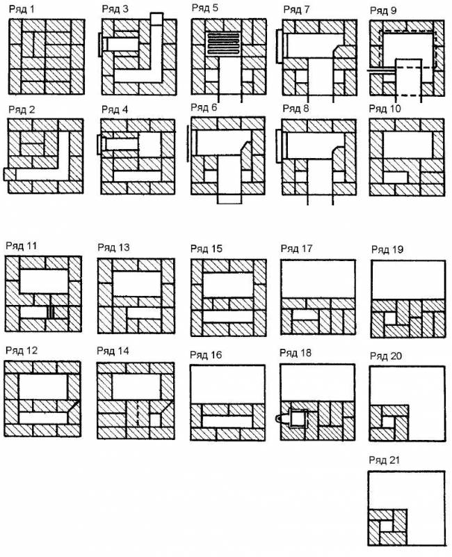После приготовления раствора можно приступать к кладке печи. Работа выполняется в определённой последовательности: