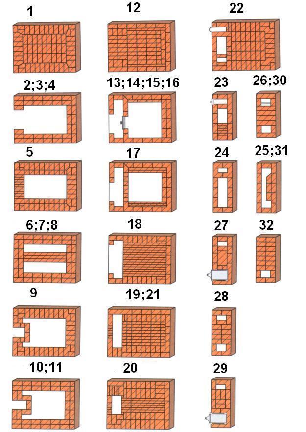 - Для следующих рядов толщина шва должна быть в пределах 2-2,5 мм. Кирпичи укладывают ребром. Ряд №16 выполняет роль свода для горнила. Его кладку начинают от края и заканчивают серединой.