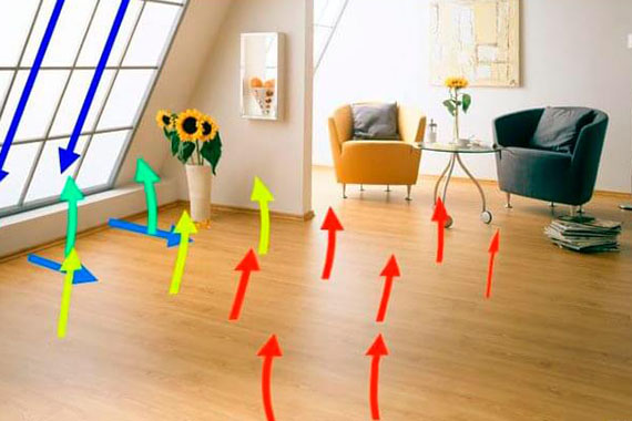 Инфракрасный пленочный пол монтируют под ламинат, линолеум, ковролин, паркет. Под такой пол обязательно монтируют отражающую изоляцию. Подложка выступает в качестве разделяющего барьера между холодом чернового пола и теплом, накопленным в напольном половом покрытии.