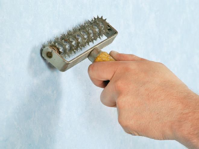Шаг 1. Примените игольчатый валик для более равномерного увлажнения обойного материала.