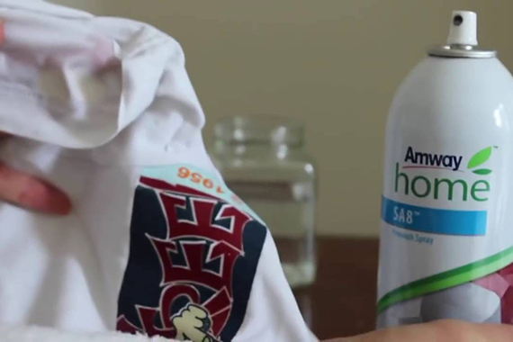 - Нашатырный спирт — разведите 20 капель в стакане воды. С помощью ватного диска протирайте пятно до его исчезновения. После этого постирайте одежду привычным способом.