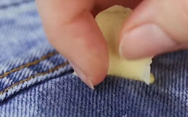 Следующий шаг — очистка оставшейся части загрязнения. Для этого возьмите полиэтиленовый пакет, положите в него брюки и поместите в морозильник на время от 10 минут до получаса. Если у вас нет возможности использовать морозильник, можно приложить к пятну сухой лед или любой замороженный продукт.