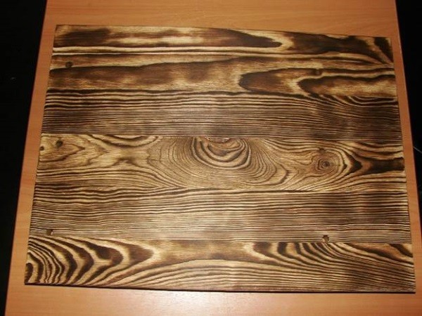 Воздействие открытым огнём на поверхность в течение различного времени позволяет достичь разнообразных оттенков – от светло-коричневого до глубокого черного. После этого часто применяется обработка с помощью металлической щётки (браширование).