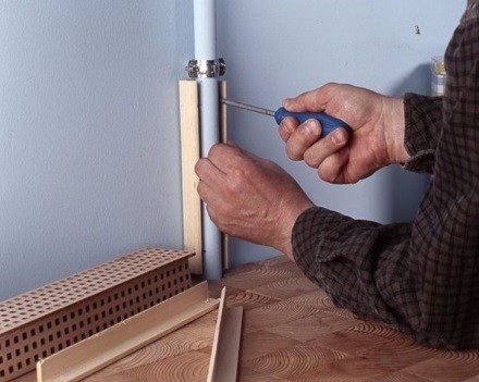 Очень популярны П-образные или полукруглые короба. Крепить их нужно только к направляющим, прикрепленным к стене, с двух сторон от трубы. Фиксация выполняется при помощи саморезов или клея – последний вариант несколько хуже, так как при демонтаже декоративный элемент может быть поврежден.