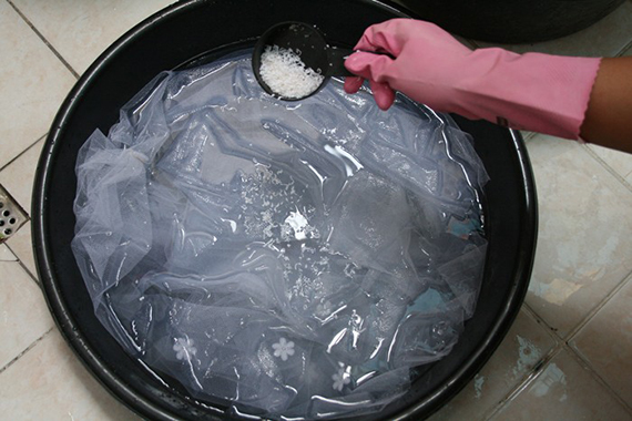 Чтобы вернуть белизну деликатным изделиям из полиэстера, воспользуйтесь следующим способом. В небольшой тазик с теплой водой добавьте по 2 столовые ложки соды и соли, а также 1 столовую ложку порошка. Хорошо перемешайте и замочите в этом растворе изделие на 20 минут, после чего постирайте и прополощите.