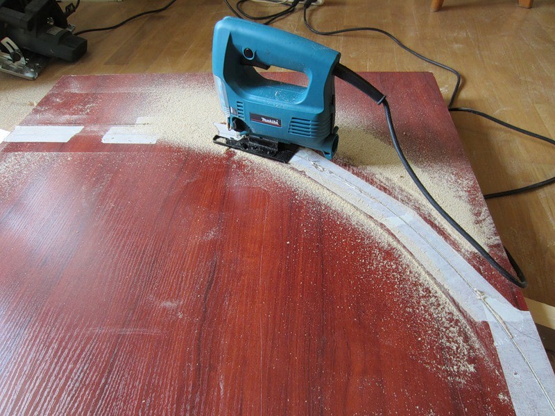 Можно использовать диск с большим количеством зубьев. Например, хорошо подойдёт диск по алюминию. Если в столешнице нужно сделать круглое отверстие, можно использовать биметаллические коронки по дереву или электролобзик с пилками по дереву. Чем крупнее зубья на пилке, тем легче будет пилить материал.